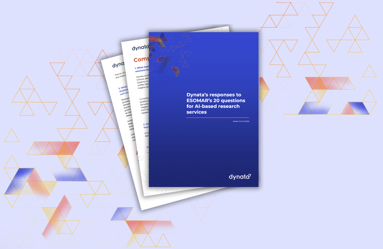 Dynata’s AI systems enhance survey accuracy, efficiency, and deeper insights, enabling deeper insights at scale. Learn more by reading our response to the ESOMAR 20 Questions: AI.